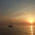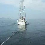 På eftermiddagen avseglar vi med Capella i den svaga vinden. När det mojnar helt tar vi Capella på släp in till Bayona.