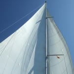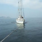 På eftermiddagen avseglar vi med Capella i den svaga vinden. När det mojnar helt tar vi Capella på släp in till Bayona.