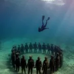 I en vik på västra kusten ett par kilometer norr om huvudstaden St George finns en undervattensskulpturpark. På mellan ett par och 14 meters djup finns 65 skulpturer. Vi tog en två timmars cykeltur dit en dag. Längs vägen stannar vi och tittar på ett gäng som nätfiskar från land men cyklar vidare innan någon fångst visar sig. Inte en skylt fanns det men många människor att fråga. Vi trodde det skulle vara mycket folk och en hel del kommers runt detta, med uthyrning av dykgrejor, servering mm men så var det inte, vi hade viken för oss själva. På en liten strand träffade vi en kille som rodde oss ut runt udden i sin eka. En boj gjorde att vi lätt hittade den första gruppen skulpturer på drygt fyra meter. Efter en del letande hittade vi ytterligare några skulpturer på större djup. Fina fiskar och många sorters koraller såg vi också. Vi hade med oss mask och snorkel men hade lämnat fenorna hemma. Nästa gång blir det förhoppningsvis med dyktuber och guide, för det var helt klart en häftig upplevelse. Vi har lånat några bilder från internet på vad som ska finnas där nere. Här finns konstnärens hemsida!