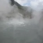 Vi når målet, en avsats ca 20 meter över den kokande sjön. Sjön är ca 100 meter i diameter och en del av den hävs hela tiden upp av kokningen. Ångan från sjön blandas med dimmor som bildas, ibland kommer en vindpust och gör sikten klar från sjön och hela vägen ner till havet. Det är fascinerande och stort men kanske var Valley of Desolation en större upplevelse som vi var mitt inne i – här står man och tittar på något.