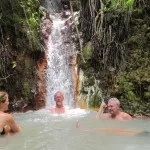SeaCat skär upp sallad och serverar lunchen; saltfisk och matbanan. Mätta vandrar vi tillbaka genom kratern, stannar vid en källa och tar ett bad i ca 40-50 gradigt vatten, för att stärkta fortsätter vi upp längs berget. Nu kroknar ytterligare en i gruppen som SeaCat får stötta och vi andra fyra går själva upp till toppen och sedan ner längs berget.