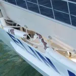 Ett antal båtar har förtöjt utanpå oss och en av dem, en katamaran råkade köra in i oss. Deras vassa hörn gjorde en ful skada i vår reling och stukade vårt mantåg. Att svetsa och måla här skulle ta för lång tid så vi skjuter upp det till vi är i Sverige men vi har gjort klart med ersättning och så.