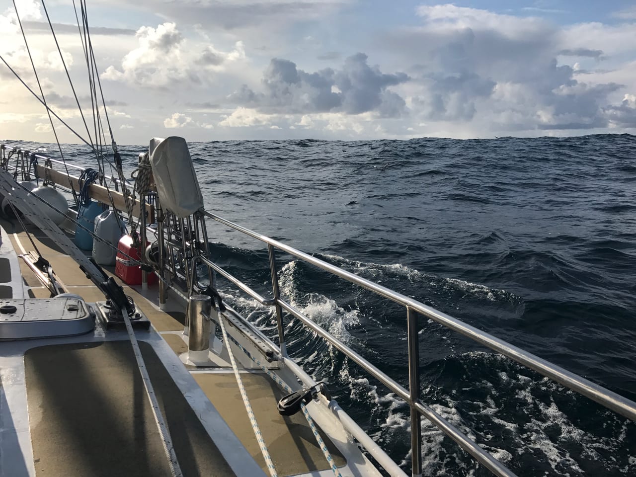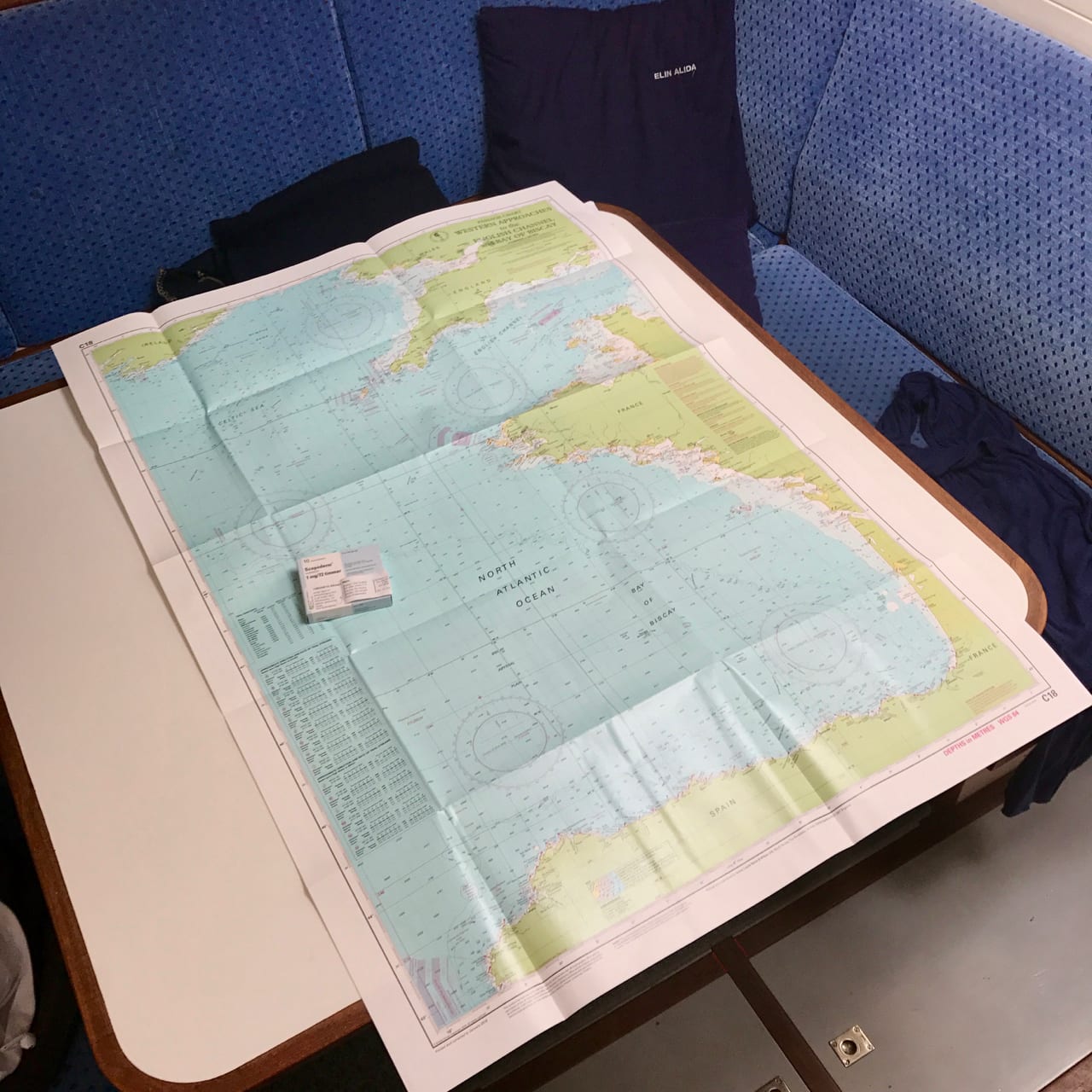 Det blir två dagar Kilmore Quay innan prognosen för att ge sig ut på havet är rätt. Nu ser det ut att kunna bli en hel vecka utan risk för starka vindar på Biscaya och de kommer att vara väst till nordost – helt rätt för oss. Vi har inte bestämt oss för om vi ska gå raka vägen till Galicien i norra Spanien som på förra resan, eller om vi ska sikta på Bretagne och följa Frankrikes västkust en bit söderut innan vi går mot Spanien. Målet spelar inte någon roll det första dygnet när vi seglar lite väst om syd för att få lite avstånd till Scilly-öarna. Sedan tidigare har vi lärt oss att det är bra att hålla på rutinerna och kör direkt igång med tre-timmars vakter dygnet runt. Då det innebär att vi inte sover mer än högst två och en halvtimme i taget blir det att sova även på frivakterna på dagen för att orka med. Vi ser nästan inga andra båtar, varken i verkligheten och knappt heller på AIS-mottagaren innan vi är framme vid separations-zonerna som är de fasta rutter på havet som stora fartyg måste följa på sin väg genom Engelska kanalen och söderut på Atlanten. Zonerna är bra får oss små båtar, för även om vi inte får snedda over dem utan måste passera vinkelrätt så kan vi räkna ut när och var det är rätt att korsa dessa rutter. Ganska snart växer beslutet om att gå till Bretagne fram, och även om det är bra förutsättningar för att fortsätta direkt till Spanien är vi sugna på att besöka Frankrike. Via Oceanseglarklubbens facebookgrupp har vi fått en massa tips på bra hamnar längs hela Frankrikes och Spaniens kust mot Biscaya.