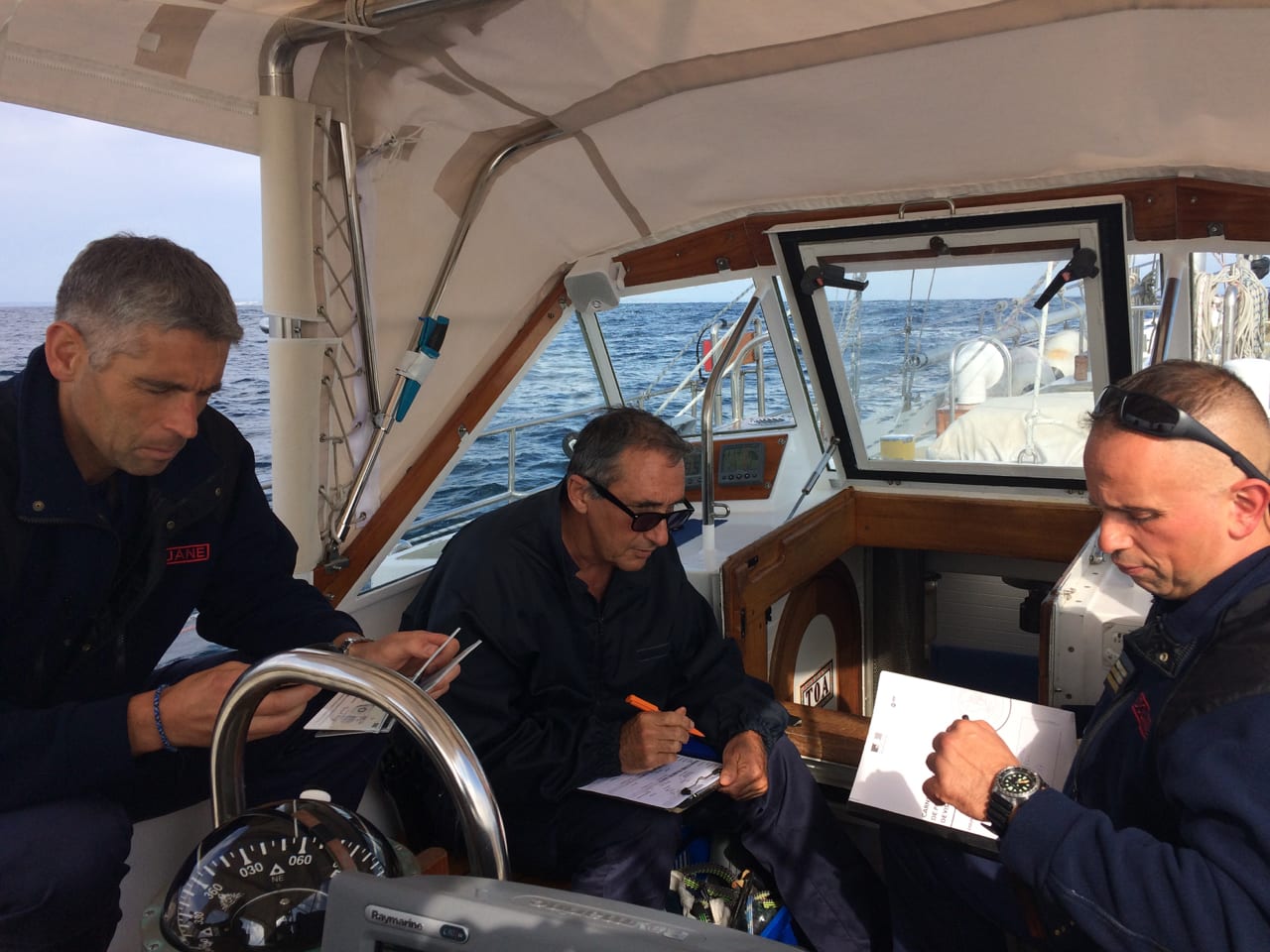 Efter två nätter och tre dagar närmar vi oss Camaret-Sur-Mer i närheten av Brest. Då blir vi uppropade av ett fartyg från franska tullen som har frågor om vår rutt och via en ribbåt kommer fyra personer ombord och går igenom alla våra handlingar och också vår båt.