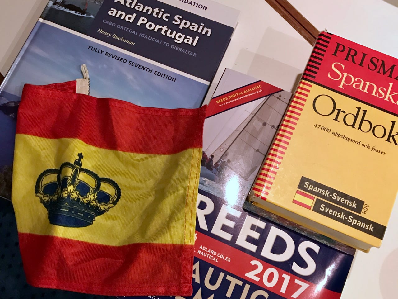 Nu tänkte vi berätta lite om seglingen över Biscaya. Det här är kanske den längsta överseglingen vi kommer göra (om vi inte bestämmer oss för att ta ett skutt över till Kanarieöarna förstås). Från Concarneau till A Coruna är det ungefär 340 sjömil. Med rätt vindar och om allt går bra bör det ta två och ett halv dygn. Som vanligt ältar vi väderprognoser och väntar in en riktigt pålitlig väderlucka. Ott och Päivi på TuSan ska åt samma håll så vi hjälps åt att analysera prognoserna och kommer fram till att det blir bäst att åka på fredagsmorgonen. Då har den starka västvinden vridit till nordlig sedan några timmar, vågorna borde hunnit minska och vi har marginal så att vi utan problem hinner fram till den spanska kusten innan det mörknar på söndagskvällen. Vinden ska under de närmaste tre dygnen vrida från rent nordlig till västlig så vår plan är att hålla så västlig kurs som det går utan att vi tappar fart och att det blir jobbig segling. I höga havsdyningar är det bara jobbigt med ren medvind, sk plattläns, så nu kan vi se till att ha vinden snett bakifrån, få den bästa seglingen, och när vi närmar oss Spanien kan vi välja vilken hamn vi vill sikta på beroende på hur mycket vinden vridit till väster.