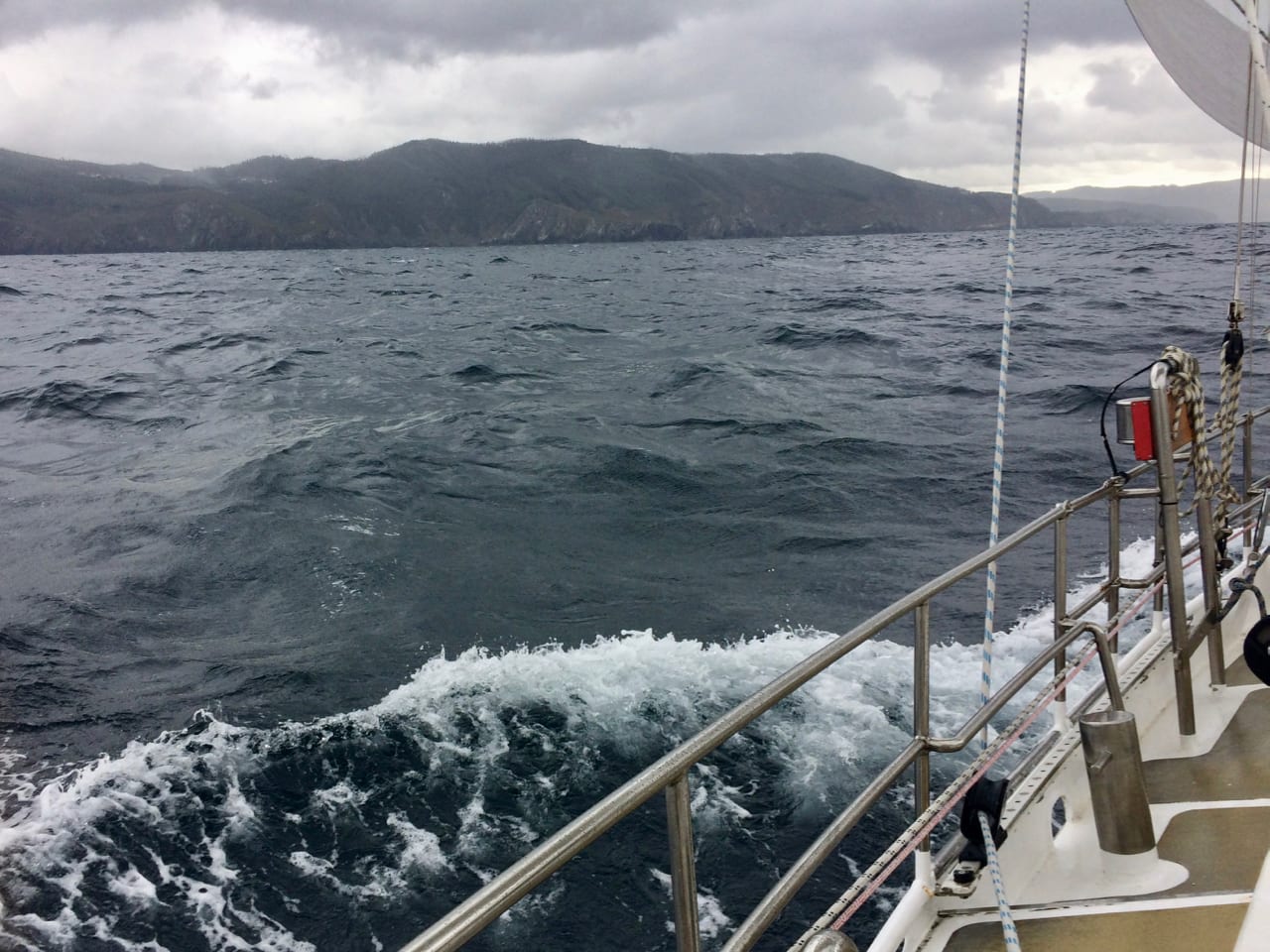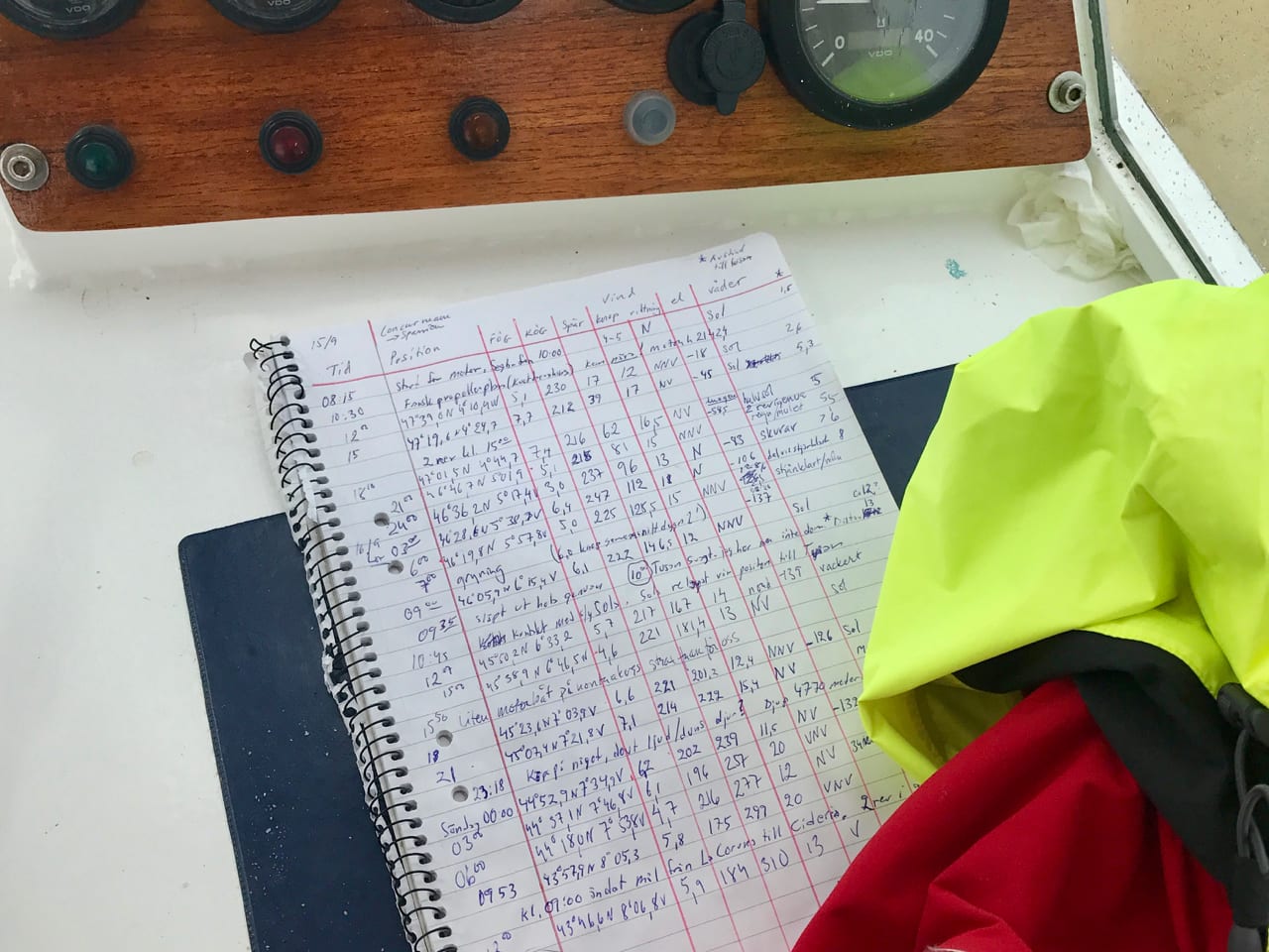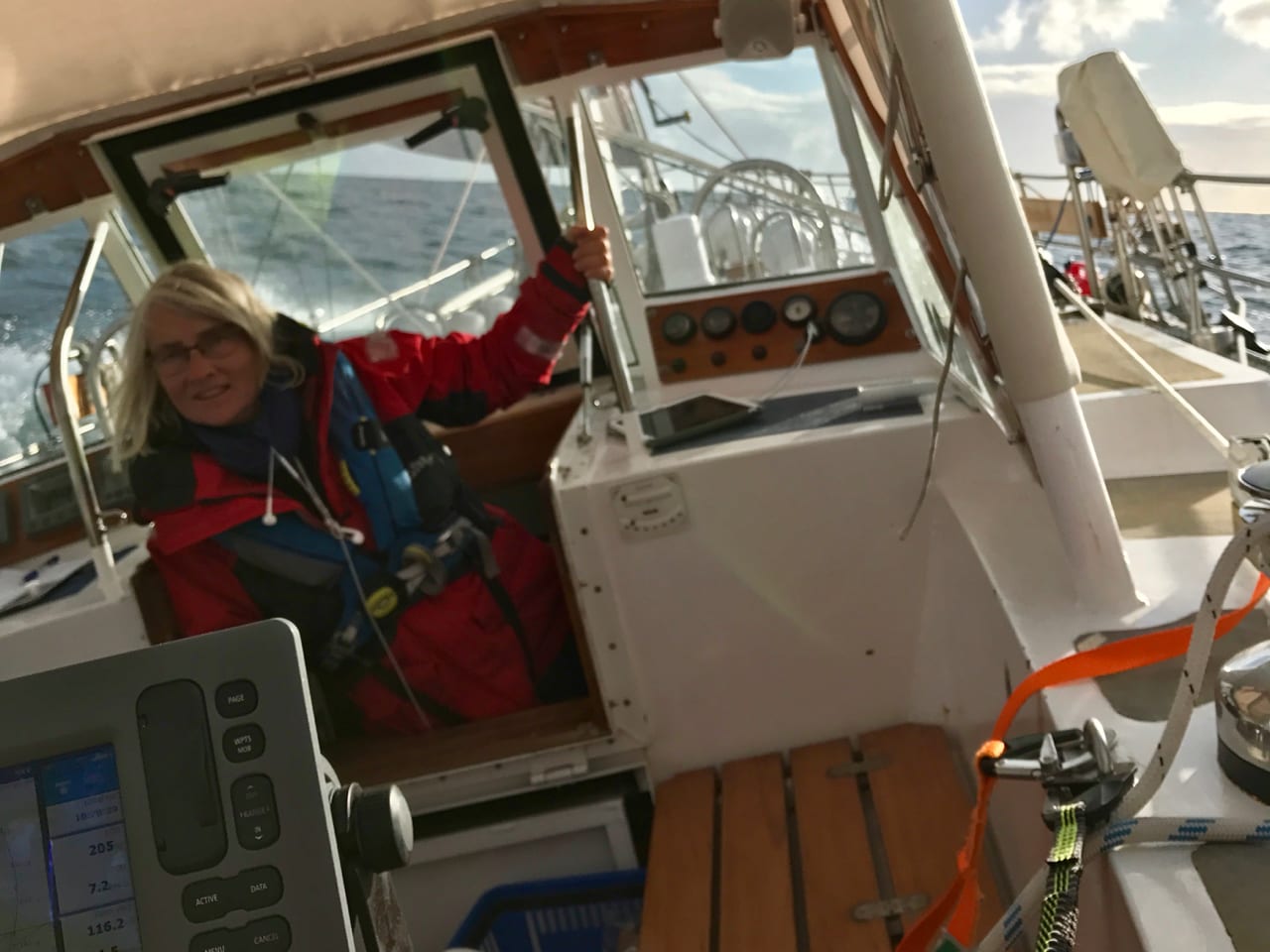 Det blir två timmar för motor innan vi kommer ut på havet och får vind, men sen håller den vinden i sig hela vägen till Galicien. Det blåser nordväst men i början mer åt nord och på slutet mer åt väst precis som prognosens visade. Vindstyrkan är runt 8-10 meter per sekund lite lägre ibland och som mest 16 meter per sekund ett tag under sista natten. Då är det lite för mycket för att det ska vara behagligt. Vi tog två rev i storseglet inför första natten, reven behöll vi sedan resten av tiden. När det blåste som mest rullande vi även in en del av genuan. På nätterna passerar några regnskurar men annars har vi mest uppehållsväder och ibland sol. Flera gånger har vi besök av delfiner och stjärnhimlen dyker upp mellan molnen.
