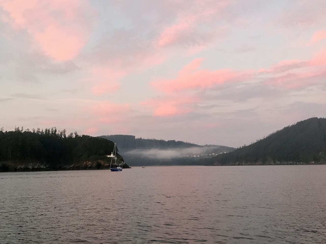 Resan över tog två dygn och fem timmar. Vid lunchtid på söndagen hade vi några timmar kvar till rian (viken) där A Coruna ligger. Himlen mörknade och det såg ut att bli regn. Rakt framför oss hade vi Ria de Cedeira, en fin och skyddad vik med en mysig stad där vi var på vår förra segling – det var ett lätt beslut att ändra mål och gå mellan de skyddande bergssidorna och ankra upp bredvid lokala fiskebåtar med den långa sandstranden i fonden. Biscya avklarat!