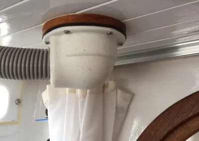 Monteringen av den nya toan var enkel. Vi tog bort den gamla toastolen men valde att låta de rengjorda slangarna ligga kvar under durken om vi skulle ångra oss. Toan fästs med två rostfria beslag i golvet/durken. Därefter ska bara ventilationsslagen dras till en genomföring i däcket. Vi hade som tur var en ventil i taket som passade perfekt. Fläkten sitter inte på toan utan vid genomföringen i taket så en elkabel behöver dras samma väg.