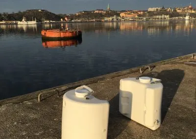 Urinbehållaren är ganska liten (tre gånger har det blivit översvämning!) så vi har köpt en extra behållare för att kunna byta när vi inte kan tömma i land. Man kan förstås också ha en vanlig dunk att fylla över till. Vår rutin nu är att byta behållare varje morgon och sedan ta den andra med iland och tömma antigen i en vanlig toalett eller, om det finns, i den speciella tömingsstationen som finns i en del marinor. Den består av en ho med ett vattenmunstycke i mitten som med högt tryck spolar ur och tvättar rent behållaren.